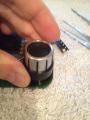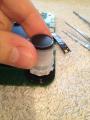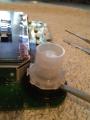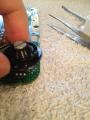 2) Die zweite Kappe mit dem Deckel für den Button (ohne Symbol bzw. mit On/Off Symbol) ist sehr fest gesteckt aber eben nur gesteckt. Die Platine wieder sehr gut fixieren (mit den Fingern) und die Kappe abziehen +