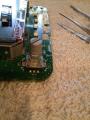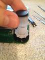 1) Wenn die Platine frei liegt, einfach die silber/schwarze Kappe nach oben abziehen. Besonders auf der linken Seite muss man dazu die Platine sehr gut fixieren, da ansonsten an der "Sollbruchstelle" leicht ein Sprung entstehen kann. Die Kappe ist nur gesteckt, also einfach ziehen.