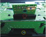 Der Blaue Kreis ist die Öffnung in der Platine, wo die Kunstoffnase einhakt und auf dem unteren Teil des Bildes sieht man die Kunstoffnase im gelben Kreis.
