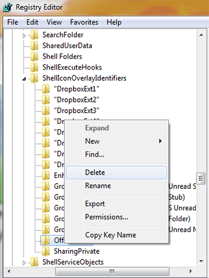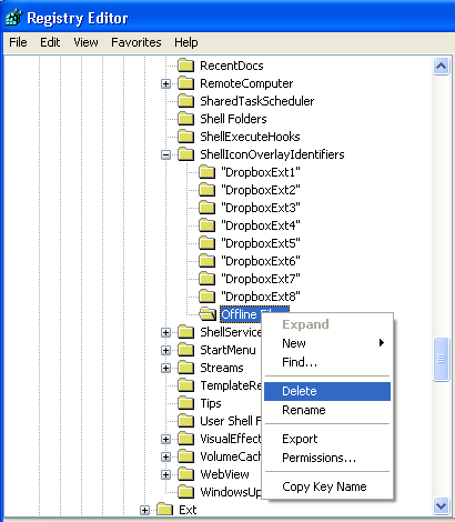 If the Dropbox overlays are in the first 15 positions, they will display; otherwise you'll need to make room for them. Please note that this requires you to delete or deprioritize other applications' overlays, so only proceed if you’re sure about what you'll affect. - If you decide to proceed, you can select individual keys and delete them by right-clicking on the desired key. If you don’t want to delete them, you can rename them and place a "Z" at the beginning to send them to the end of the alphabetically sorted list.