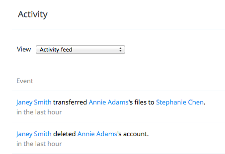 - On the Activity page, view the Activity feed to confirm if the deleted member's files were transferred to another team member.