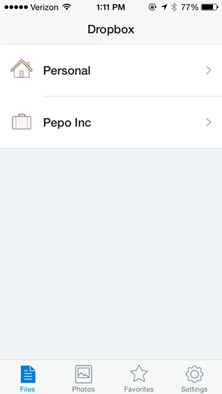 Two different Dropbox accounts can also be accessed from within the Dropbox mobile app. From the home screen, you can select either your personal or work Dropbox. Simply return to the home screen at any time to switch between them.